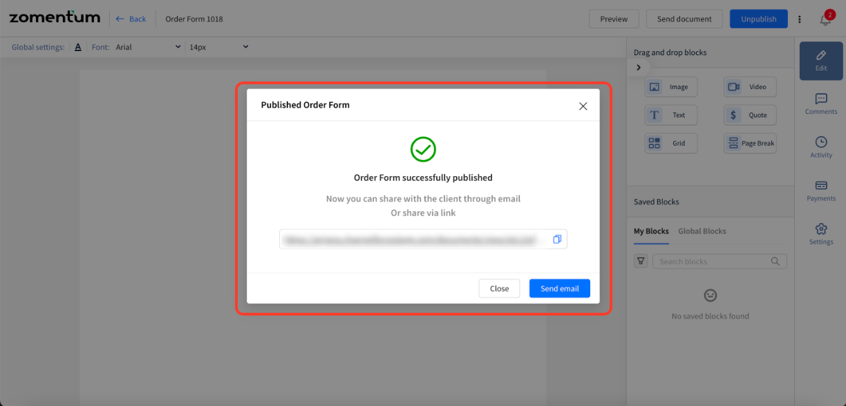 Once the user clicks on that, the Order Forms are published and a link is generated. The user can share the Order Forms with the client as a link or send an email.