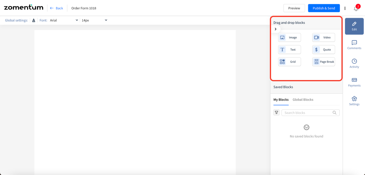 The blocks available to create the Order Forms are very similar to the blocks available in the quote. Only the signature block isn’t available