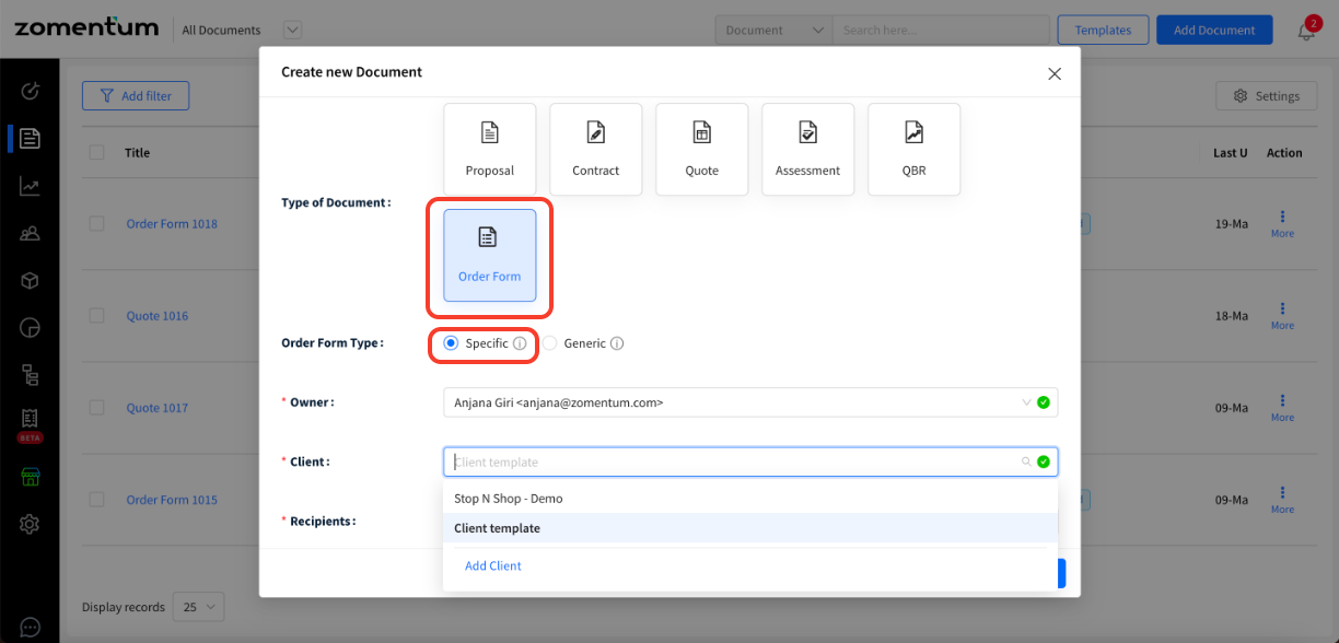 The user needs to choose the client, recipients and the Tax region of the document. Then proceed with creating the document that is the same as creating generic Order Forms.